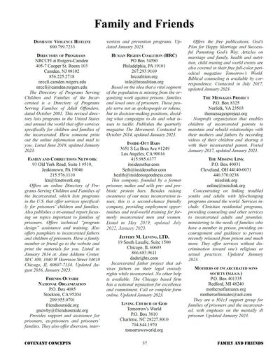 The contact information listed originates from several different sources, most unaffiliated with the Department of Correction. As editor I cannot guarantee the existence, reliability, or services of any entities listed herein, nor does Covenant Concepts endorse, support, or validate any of the information in this guide. Nothing in this guide should be construed as reflecting Covenant Concepts' policies or the views of our staff.